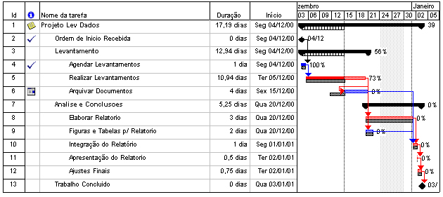 Esses diversos atrasos levaram a data de entrega a ser atrasada como indicado na linha 13 - Trabalho concluído. O losango branco representa a data meta do Plano Base e o losango preto, a data de entrega calculada ao atualizar os dados do projeto. O desafio do gerente é definir ações corretivas para colocar o projeto de novo nos trilhos, terminando quando devia terminar.